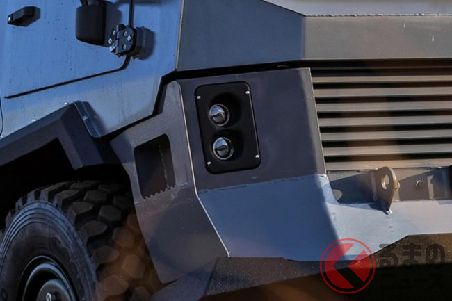 ものものしいボディはSVIオリジナルで、アサルトライフル(自動小銃)の銃弾を受けても貫通しない装甲板を採用しています。最低地上高は300mm。フロント下側には格納式の電動油圧式スクレーパーを標準装備します。