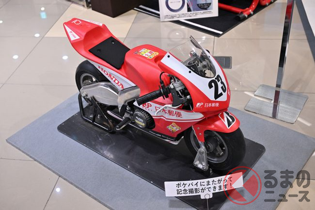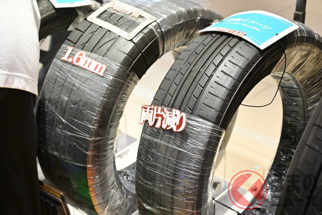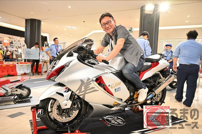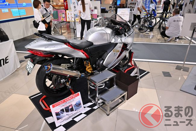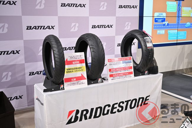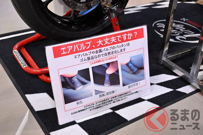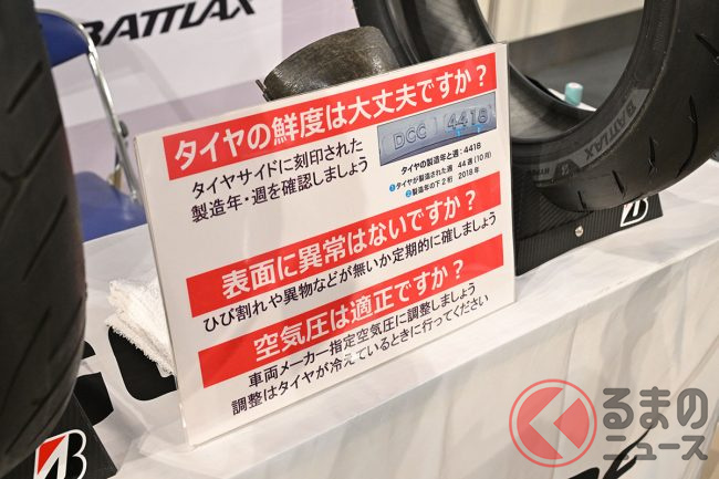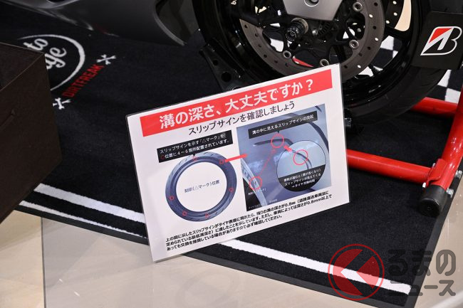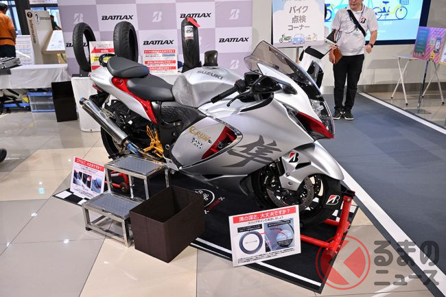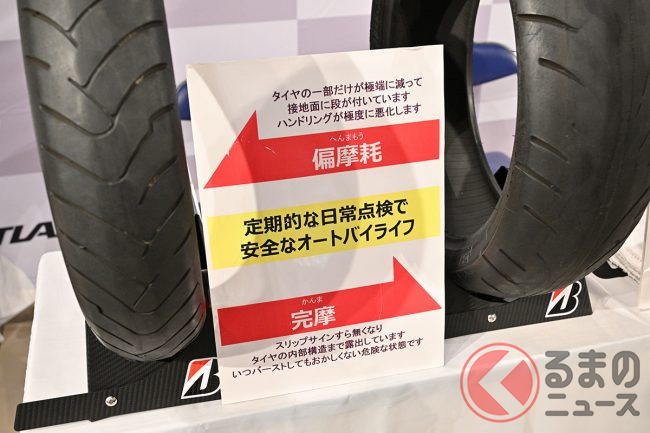 スズキ「Hayabusa」とポケバイにまたがることができる2輪のブースでは、センター部が偏摩耗を引き起こしたり、完摩(かんま)と呼ばれるスリップサインすらなくなってタイヤの内部構造が露出したりした状態のタイヤを展示。2輪用のタイヤは街乗りしているとセンター部ばかりが減る傾向にあり、たまにしか乗らないとそのチェックを忘れがちなので注意したいところです。