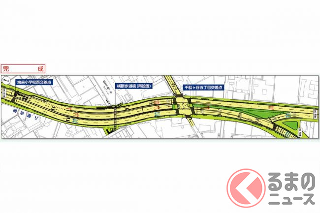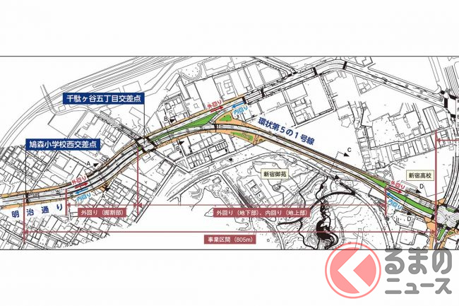 明治通りをそのまま拡幅する区間もありますが、独立したバイパスを建設する区間もあり、渋谷~池袋ではおおむね東京メトロ副都心線と同じような経路となっています。