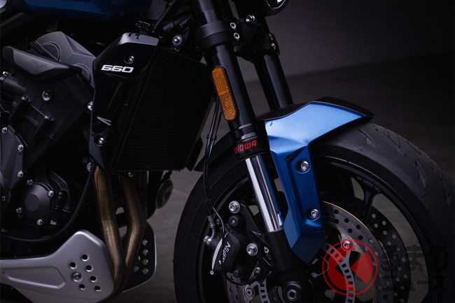 新型トライデント660は足回りにおいても大幅な改良が図られ、フロントサスペンションをハイスペックなショーワ製の41mm倒立セパレートファンクションビッグピストンフォークに刷新。