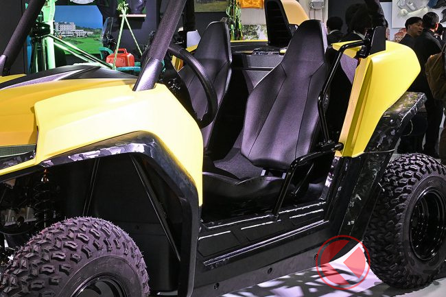 「C580」はバギータイプで、畑地や不整地など、多様な路面環境で敏捷な移動性を発揮するのが特徴。担当者の話では、過去に「軽トラだと畑の中まで入れない」という声や、農機具展への出展で「バギータイプのものがほしい」という声があり、そうしたユーザーの意見を取り入れて作ったといいます。