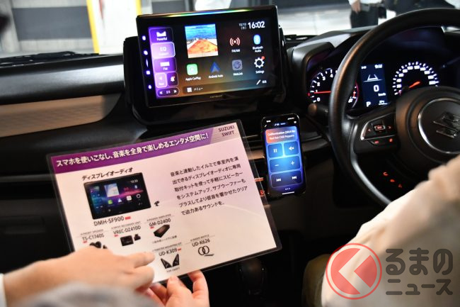 まずは2023年末にフルモデルチェンジを果たしたばかりの新型スイフトから。新型車でありながらDINサイズのナビ/オーディオを装着することもできるスイフトには、新アイテムである10.1インチの大画面を持つディスプレイオーディオの「DMH-SF900」をヘッドユニットとして装着し、パワーアンプの「GM-D2400」を組み合わせ、ハイグレードセパレート2ウェイスピーカーの「TS-C1740S」とサブウーファーの「TS-WX140DA」を運転席下に搭載するという組み合わせで、トゥイーターは専用の取り付けキットでスマートにインストールされています。