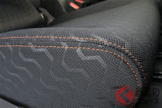 内装の基本デザインはスペーシアシリーズで共通ですが、そのうえで新型スペーシアギアではシート表皮に山の稜線や歯車、タイヤ跡などをイメージしたパターンを施し、アウトドアの雰囲気が感じられます。