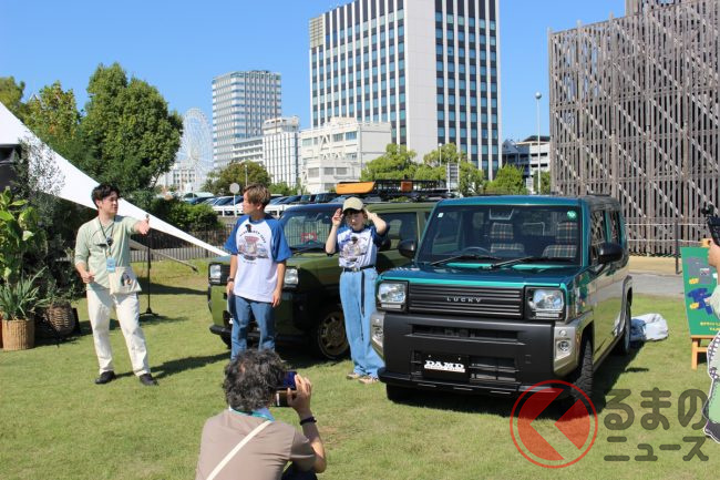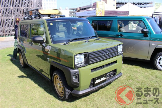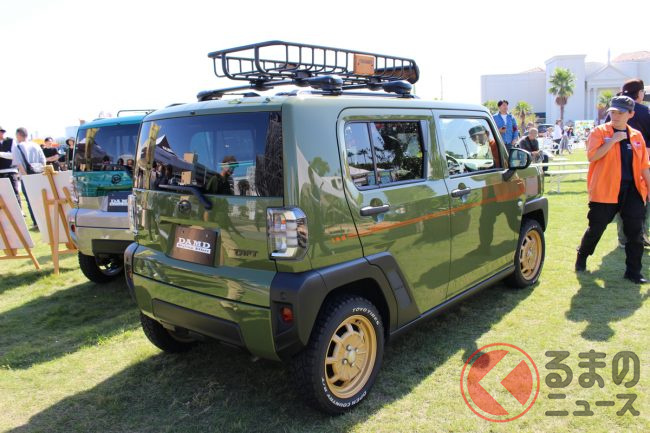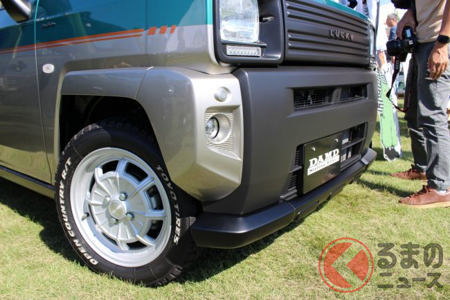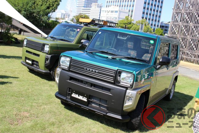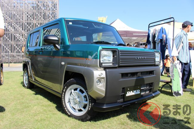 今回アンベールされたのは、ダイハツ「タフト」をベースとしたデモカー2台で、その名も「TAFT LUCKY(タフト ラッキー)」。同社で販売されている「TAFT little D.」と「TAFT 80’s」に続く、タフトの3番目のボディキットで、先行して発売された2モデルよりも、もっとライト(安価、手軽)なキットを出せないかというコンセプトのもとに開発が進められたと言います。