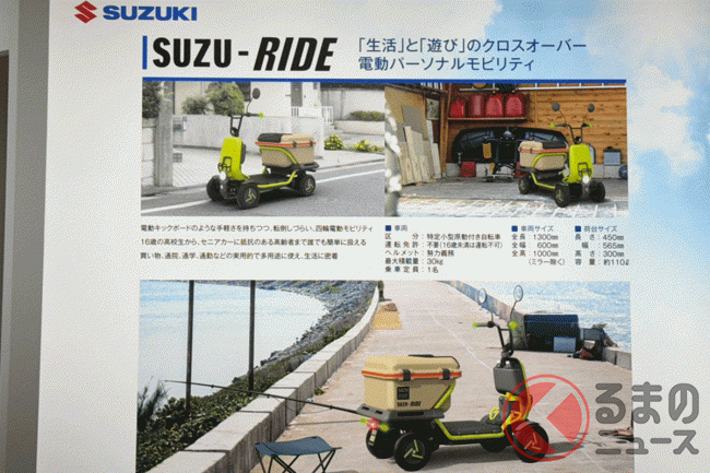 スズキは2024年10月15日、「ジャパンモビリティショー ビズウィーク2024」(幕張メッセ:千葉県千葉市美浜区)にて電動パーソナル/マルチユースモビリティ「SUZU-RIDE(スズカーゴ)/SUZU-CARGO(スズライド)」を参考出品しました。