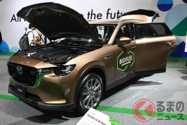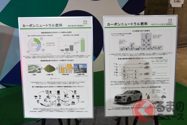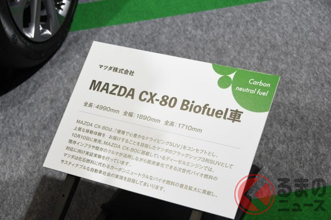 そのほか合同展示では、次世代バイオディーゼル燃料を使用する「CX-80 Biofuel車」と、次世代バイオ燃料の製作工程を説明するショーケースを展示し、カーボンニュートラル社会の実現に向けた取り組みを紹介しています。