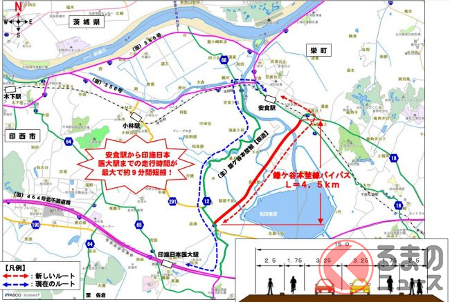 具体的には、圏央道の阿見東ICから南下し、龍ヶ崎市を経て、印西市へ入り、北千葉道路方面へアクセスするルートになっています。