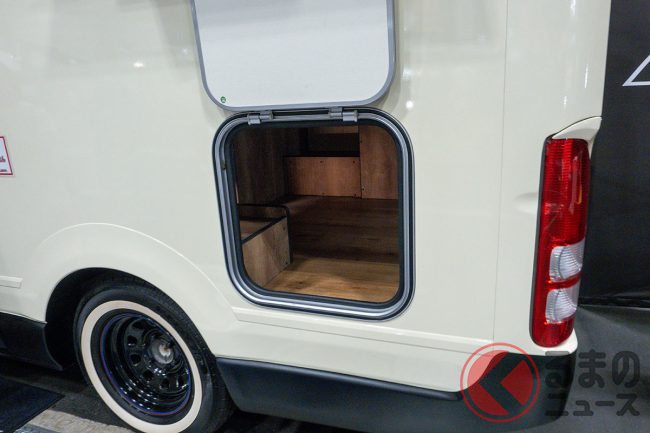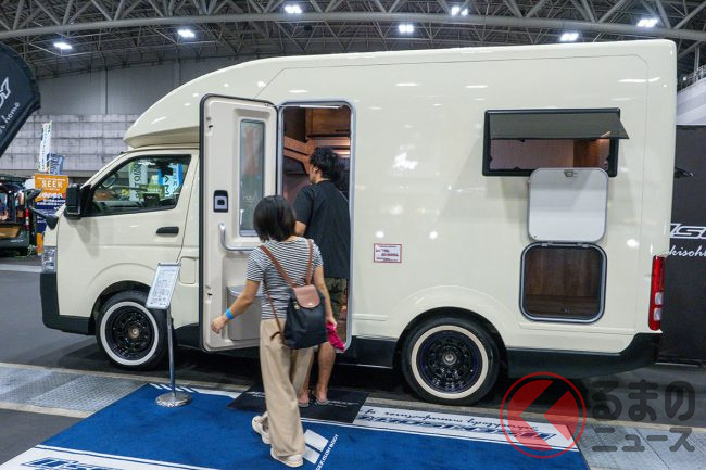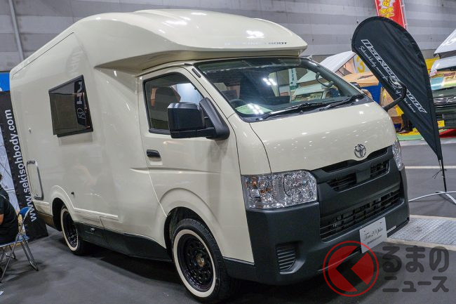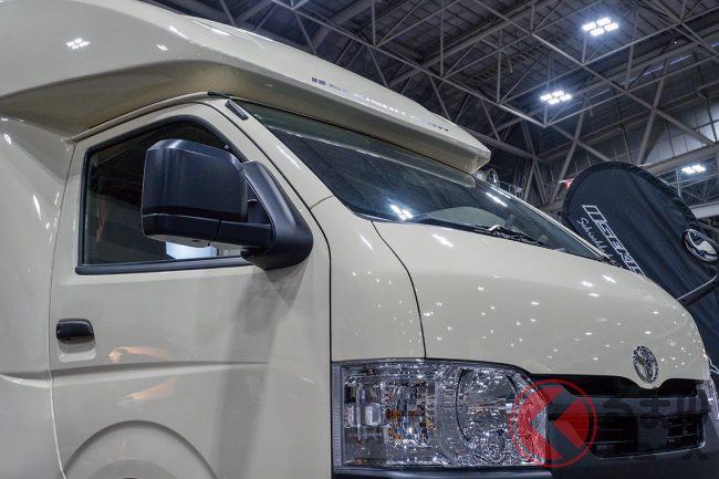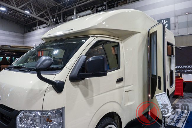 今回注目するのは、セキソーボディが展示していたキャンピングカー「TOM200 PLUS」です。ベースはトヨタ「ハイエース」ですが、見た目からして少し様子が異なるようです。