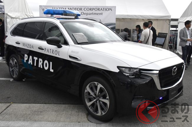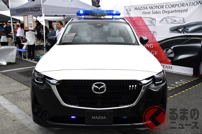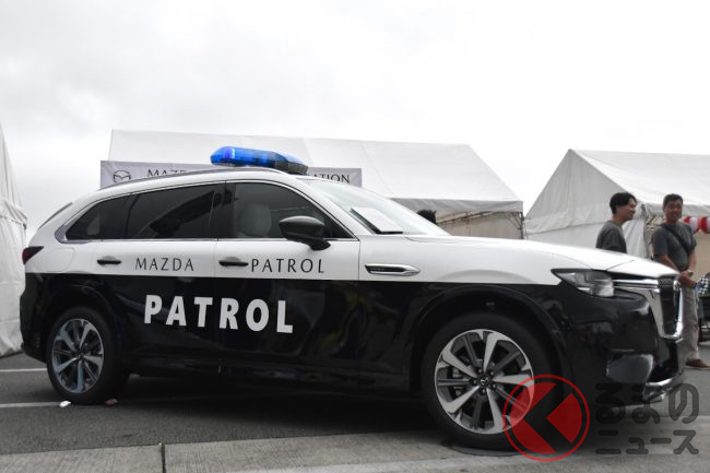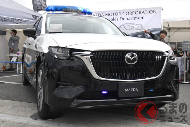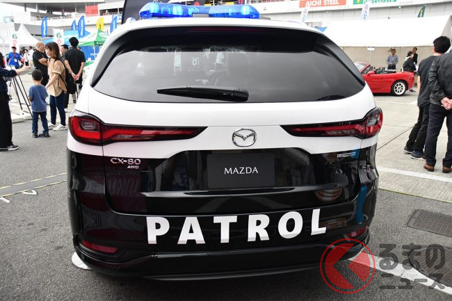 スゴッ! マツダが「高級パトカー」公開! ”白黒パンダカラー×青色灯”採用の注目SUV!? 発売直後の「CX-80」が展示された