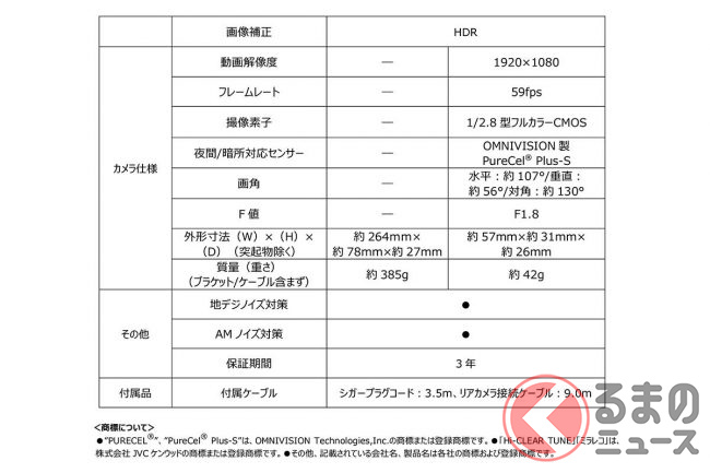 そのようななかでJVCケンウッドは本機を市場投入するに至ったといい、同社がこれまでデジタルルームミラー型ドライブレコーダー「ミラレコ」の開発で培った映像技術を生かしつつ、さらなる高画質技術を搭載しているそうです。
