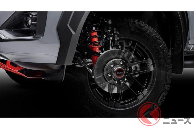 足回りは35mm径のMTV製ツインチューブサスペンションと17インチ大径ホイール、グッドイヤー製ラフテレーンタイヤを装着し、トレッドの拡大も実施。