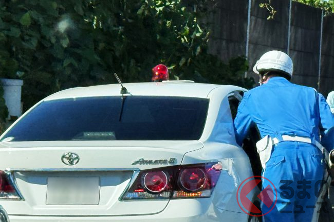 謎の「警察コスプレセダン」 違反じゃないの? 「パトカー”風”」の地味セダンに赤色灯搭載… 法的にはどうなる? 紛らわしい「パトカーソックリ仕様」許される範囲は?