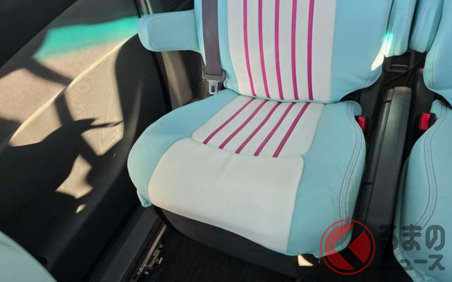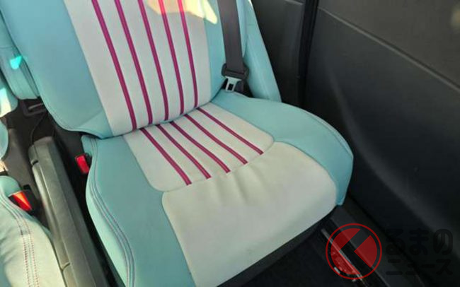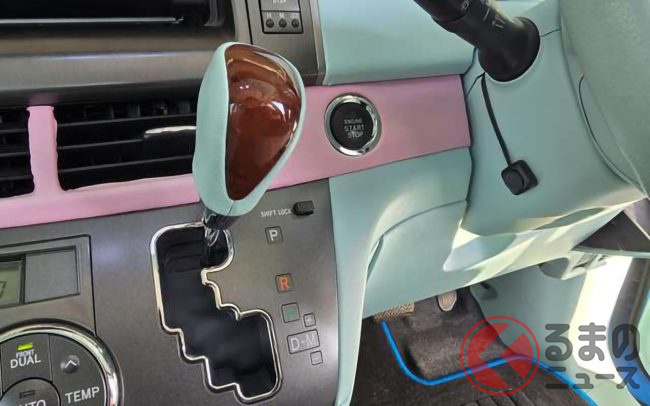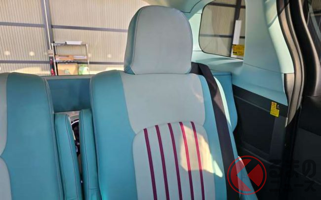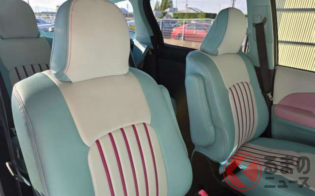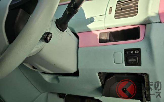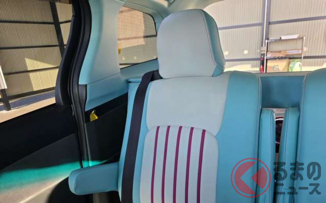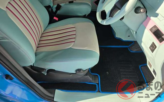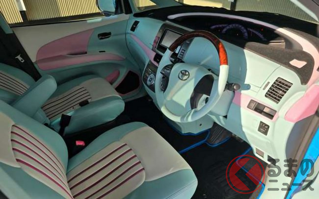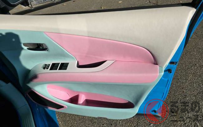 車内空間はオーダーで張り替えられた水色とピンクをベースとして、ファンシーな空間を実現しています。