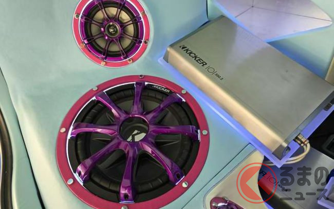 内装のトランクオーディオにはキッカーパワーアンプが3つ、サブウーファーが2つ、6つのミッドスピーカーの計11個を装備し、LEDイルミネーションが鮮やかに照らします。