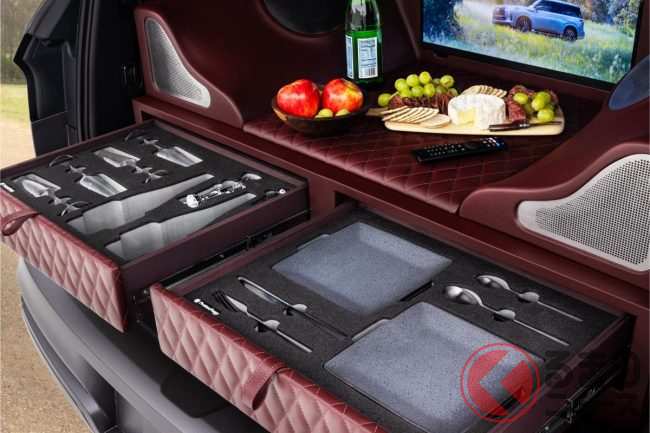 テールゲートを開けると、大きめのモニターと、Klipschのスピーカーが備えられているほか、引き出しがついており、中にはワインやワイングラス、ナイフ、お皿など優雅なピクニンクができそうな品々が収められています。