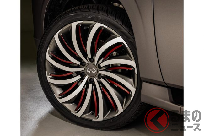 AUTOGRAPH Loungeは、エクステリアにも手が加えられており、マットブラックに塗装され迫力ある雰囲気となっているほか、足元には、QX80のもととなったコンセプトカー「QX Monograph」に装備されていた赤いアクセントが特徴的なホイールを再現したものが採用されています。