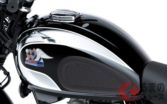 タンクには新たにデザインされた3D構造のメグロエンブレムが目を引き、サイドカバーとスピードメーターには「メグロ」タイプのロゴが配置されています。