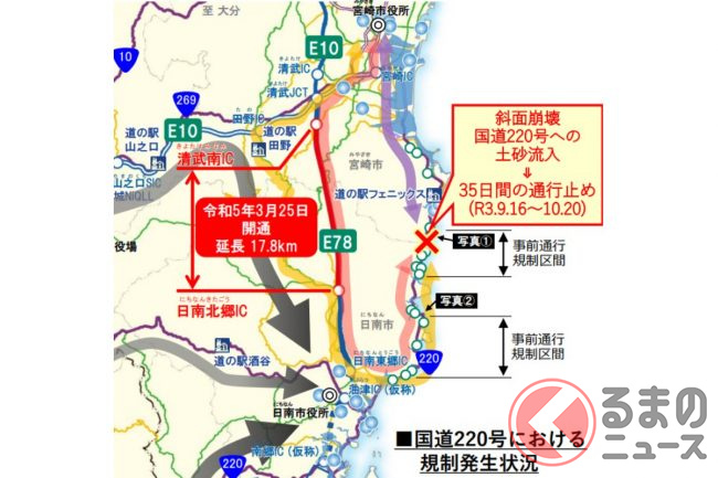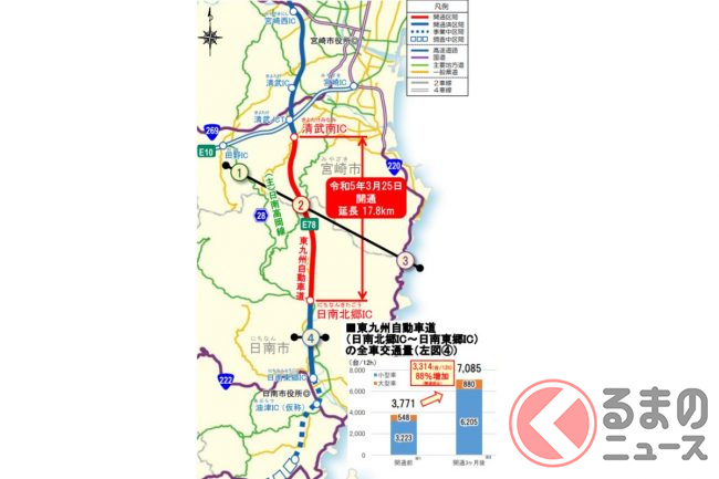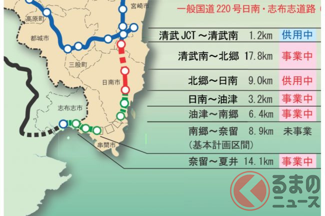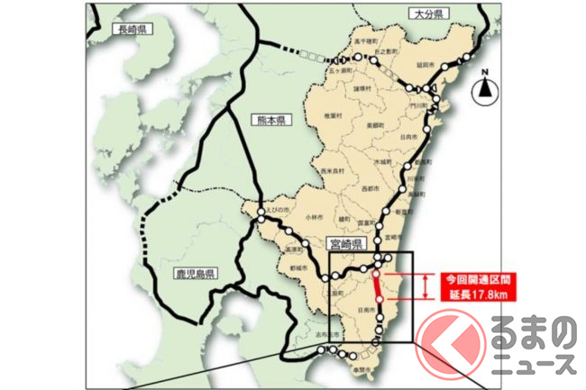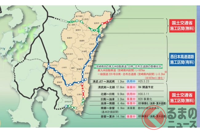 並行してライバルとなるのが「東九州自動車道」です。同様に北九州~大分~宮崎をむすび、都市間輸送のバスやトラック輸送にとって大動脈となっているため、各地で4車線化も進められています。