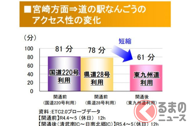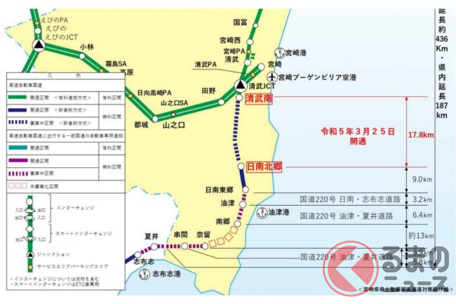 いっぽう福岡~宮崎となると、東九州道とは別のルートが主流です。たとえば高速バス「フェニックス号」は熊本経由で、人吉、都城を通ります。この場合、「九州道」と「宮崎道」が通過ルートとなります。