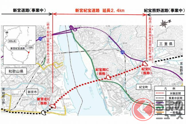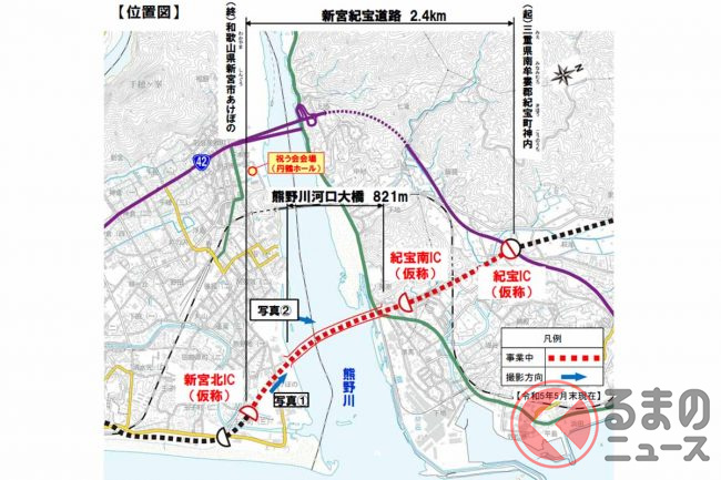 南側は「新宮道路」(4.8km)として、北側は「紀宝熊野道路」(15.6km)として、それぞれ事業が進められています。