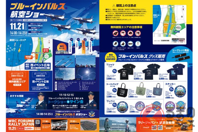 さらに豊田スタジアムでは、展示飛行の前にブルーインパルスのパイロット2名によるトークショー&サイン会やラリージャパンとブルーインパルスのコラボグッズが会場限定販売される予定です。(トークショー&サイン会の参加には、ラリージャパンのチケットが必要です)