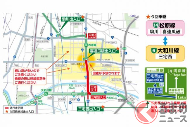 通行止めとなっているのは、大阪市と松原市にまたがり、大和川をまたぐ喜連瓜破~三宅JCT間。