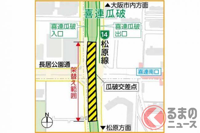 阪神高速松原線は、大阪市平野区の長居公園通をまたぐ高架橋で、老朽化のため橋桁つなぎ目の垂れ下がりが深刻化。桁の架け替えが必要となり、2022年6月1日から当該区間で全面通行止めにして、工事を行っていました。