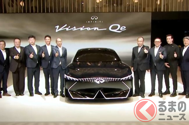 日産「次期スカイライン!?」公開で反響多数!? デカすぎグリル×ファストバックセダン! Vision Qe登場から1年… スカイライン後継といえる訳