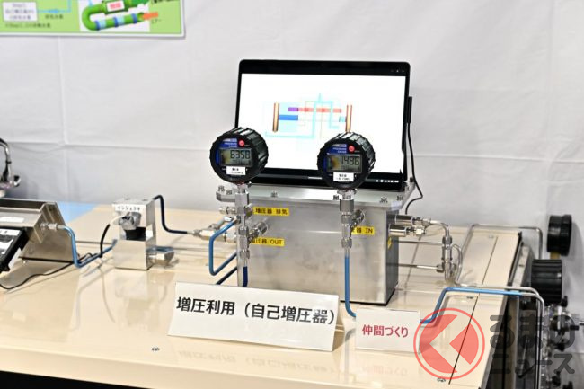 しかし、通常であれば増圧には電力などのエネルギーを必要でしたが、今回展示された自己増圧器は、ボイルオフガス自体が持つ圧力を操作することで、新たにエネルギーを使うことなく約2-4倍に増圧し、再利用燃料を作り出します。