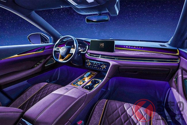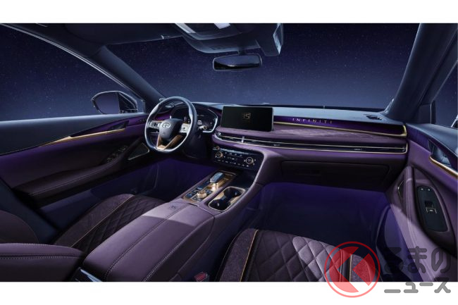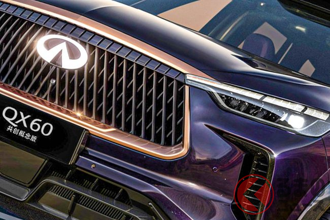 日産「新型ラグジュアリーSUV」世界初公開! 斬新「紫」内装&オラオラ「ゴールド」アクセントで超カッコイイ! ド迫力エアロもスゴイ「QX60C」中国に登場