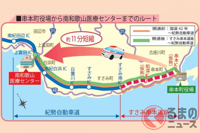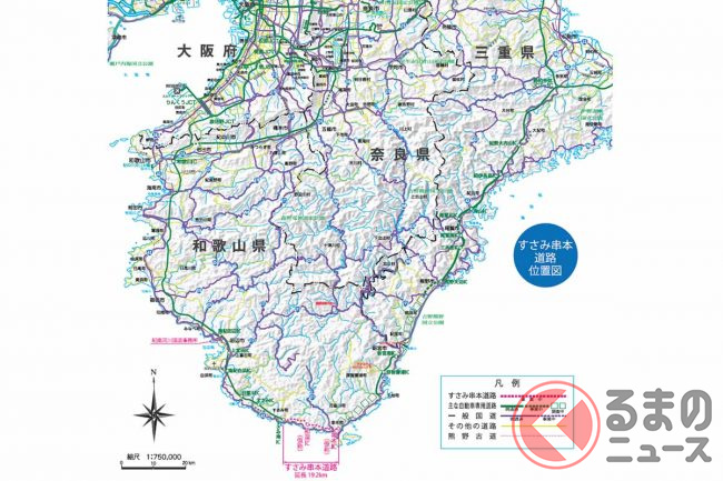 現在、紀伊半島南部で建設が進む「串本太地道路」は、半島のこうした弱点を補強する意味合いを持つ自動車専用道路で、従来から紀伊半島沿岸部を結んでいる「国道42号」をバイパスする役割があります。