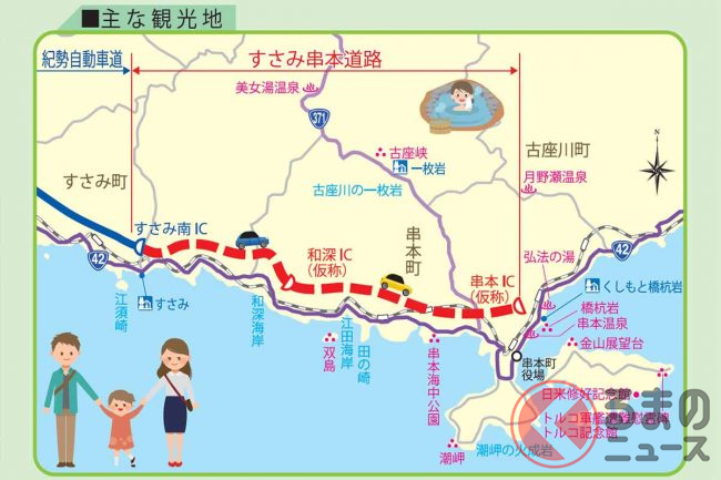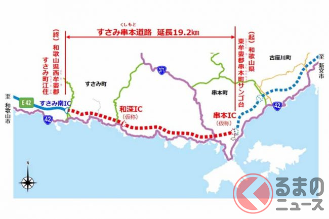 北東側はすでに開通している那智勝浦道路と接続し、西側ではこちらも建設中の「すさみ串本道路」と接続します。