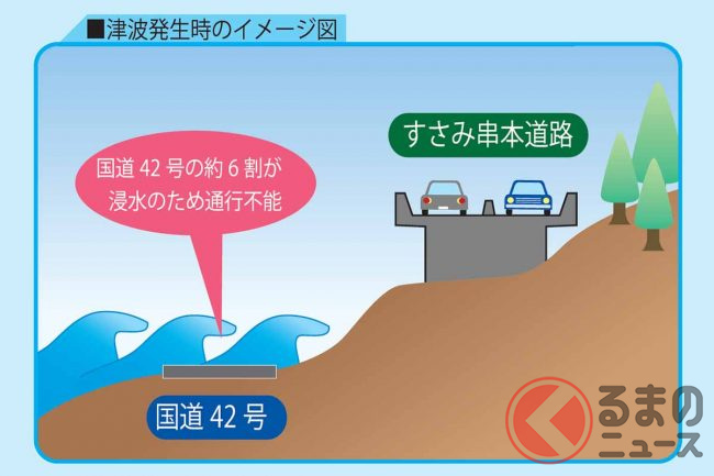 「現状の国道42号は、沿岸部を走っています。そのため、南海トラフ地震が発生すると、串本太地道路と併行する区間の国道42号の8割が浸水するとされています」(同)
