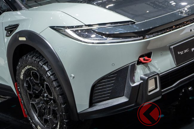 通常のbZ3Cに対し、新たにお披露目されたコンセプトモデルではオフロード走行に適しているさまざまな装備が特徴です。最低地上高を数センチ上昇、前後バンパーはよりラギッドな見た目のものへと変えており、そのシルエットはまるでまったく別の車種かのようにも見えてきます。
