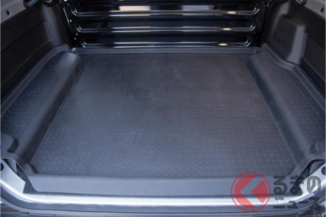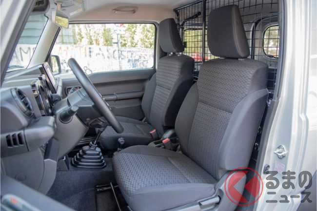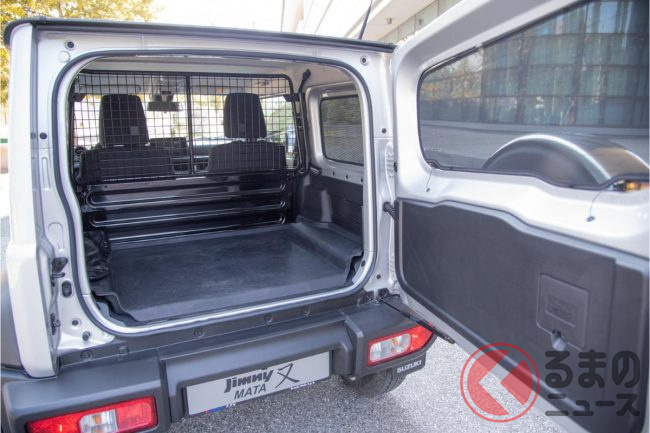 シート背後にパーテーションが設置され、それより後ろがフラットフロアのラゲッジスペースになっています。イタリアのジムニーも2人乗り仕様です。