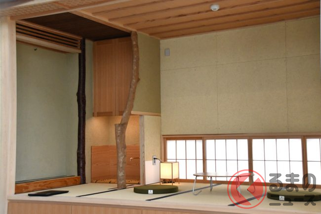 中に入ってみると、壁や仕切りがほとんどなく、大きな吹き抜けの開放感ある空間と、そのまわりと上階に小さなスペースを多く配置することで、立体的に人の視線が交わりやすい工夫が感じられます。小上がりのような和室もあり、日本人にはホッとひと息つける場所、海外から来た人には日本文化に触れてもらえるようなスペースとなっています。
