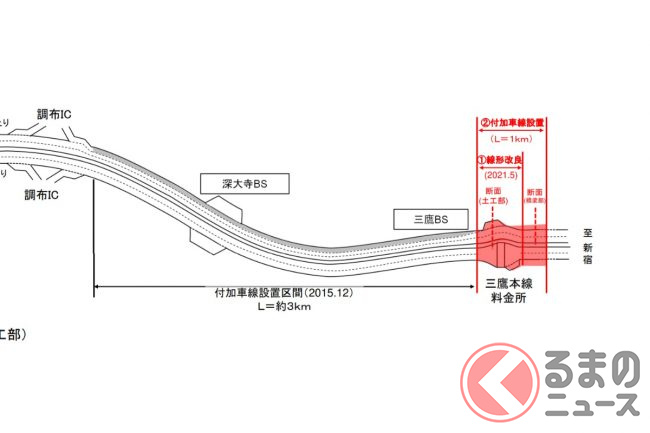 さて、この調布・三鷹サグ渋滞へ対応するため、2015年12月に調布から先の約3kmを「3車線拡幅」しました。