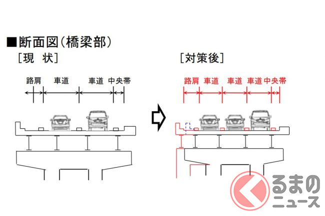 今回の拡幅は、工事を最小限に抑えるため、料金所の周辺は盛土部の車線配置変更で付加車線のスペースを捻出し、高架部分では構造物を少し北側へ拡幅する程度となっています。