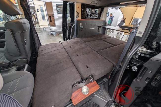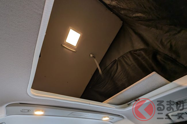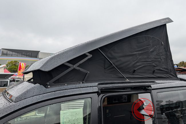 また展示車はオプションのポップアップルーフが装備されたモデルで、屋根裏部屋というべき“2階”のルーフベッド部にも、大人2名の就寝可能な空間が加わりました。