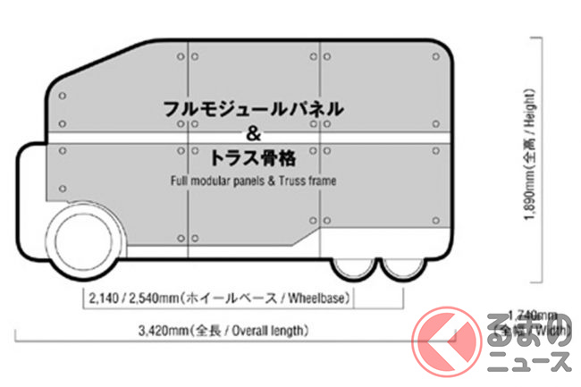 全長3420mm×全幅1740mm×全高1890mmと非常にコンパクトなボディはトラス骨格構造になっており、外装用のモジュールパネルで覆われています。