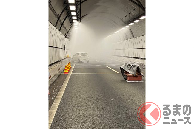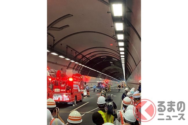 東名トンネルから「水がバシャーッ!」 異例の「通行止めで水びたし状態」なぜ? 消防車・救急車も集結! 「45年前の大事故」“風化”しないように… NEXCOが訓練を実施
