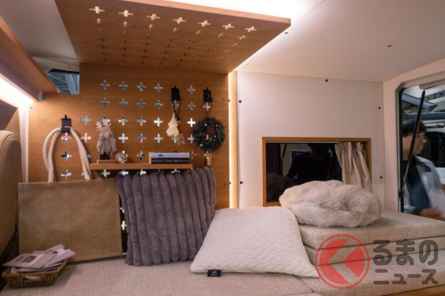 そして内装は自然を感じるウッドスタイルになっています。室内にはシンプルながらラメ模様を入れ、オシャレに仕上げています。リア側面のパネルは十字模様でくり抜き、光が入り込む形状を採用。さらに、エアコンなどの便利装備も備え付けています。