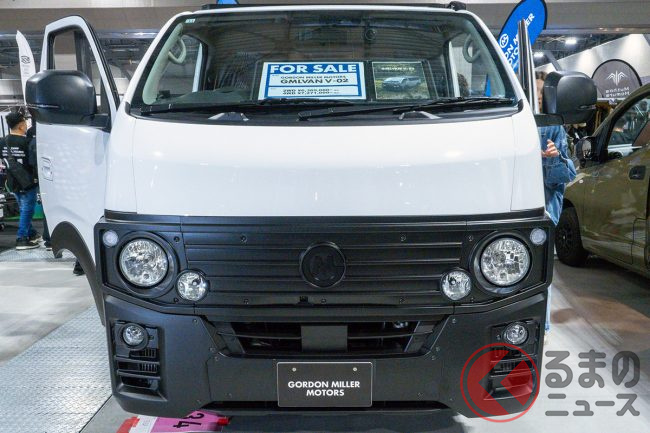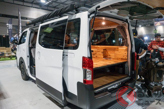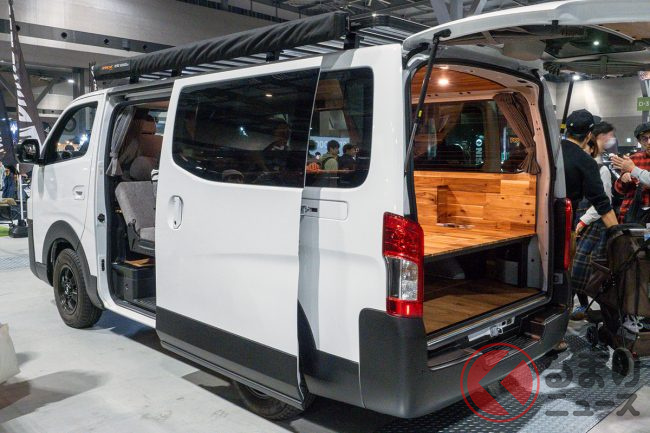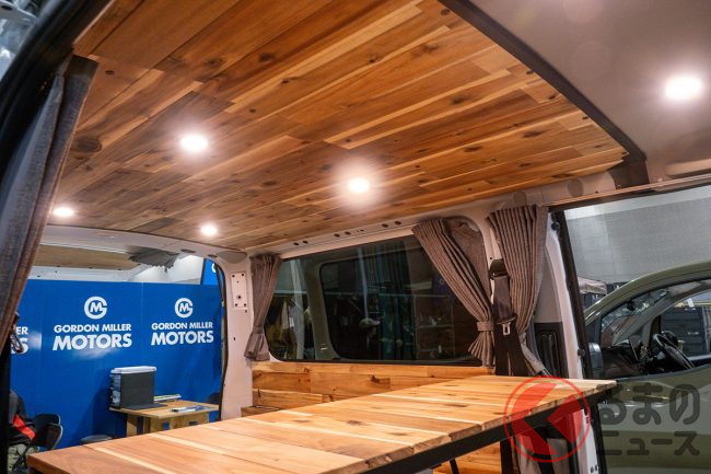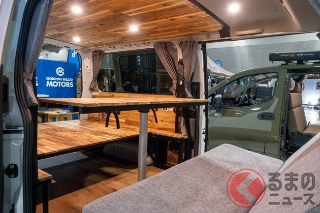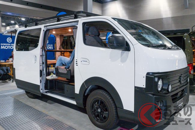 日産「“すごい”キャラバン!?」公開! 丸目レトロな“黒”顔が超カッコイイ! ウッド内装もオシャレな「車中泊」仕様「ゴードンミラーモータース GMLVAN V-02」愛知で実車展示