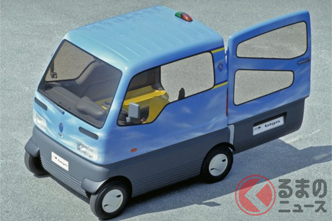全長2mで「4人乗り」! めちゃ小さい「BIGA」再び実車展示! 斬新「カクカクデザイン」の“ハコ型”ボディを採用! 便利な「街乗りモデル」提案したジウジアーロの「画期的モビリティ」とは