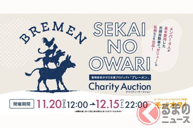 株式会社モバオクが運営するオークションサービス「モバオク」が、「SEKAI NO OWARI(セカイノオワリ) 動物殺処分ゼロ支援プロジェクト『ブレーメン』 チャリティーオークション」を2024年11月20日(水)から12月15日(日)の期間で開催すると発表。