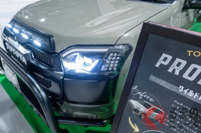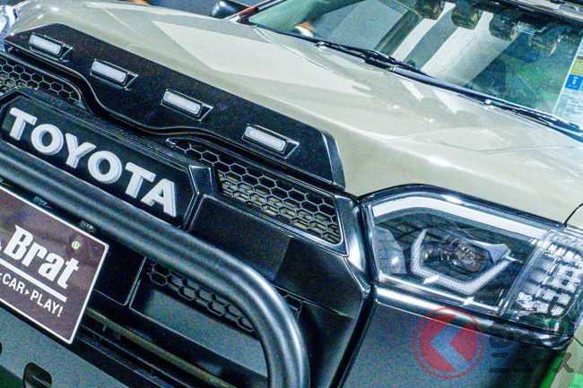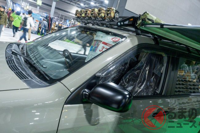 このプロボックスカスタムには、オフロード向けの改造が行われています。まず、フロントフェイスはトヨタが北米で販売しているピックアップトラック「タコマ」を思わせるデザインに変更。オリジナルのフロントガードやルーフラック、ライトなども装着してパワフルさを強調しました。