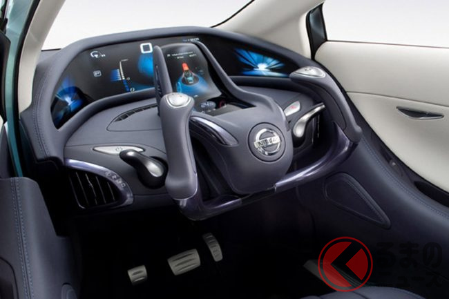 運転席には、飛行機の操縦桿を模したような形のステアリングを装備。これで一般的なクルマとは異なる、独特の走行感覚を生み出しているポイントです。