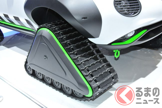 災害時などに救護活動をするレスキューで活躍できることを想定したものだそうで、クローラーが跳ね上げる岩や砂からボディを守るよう、巨大なオーバーフェンダーも装着しています。
