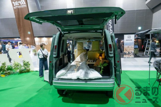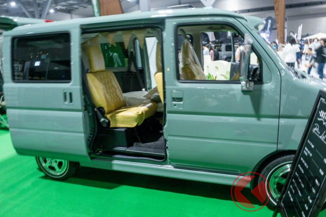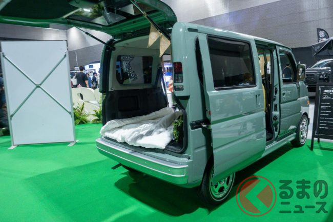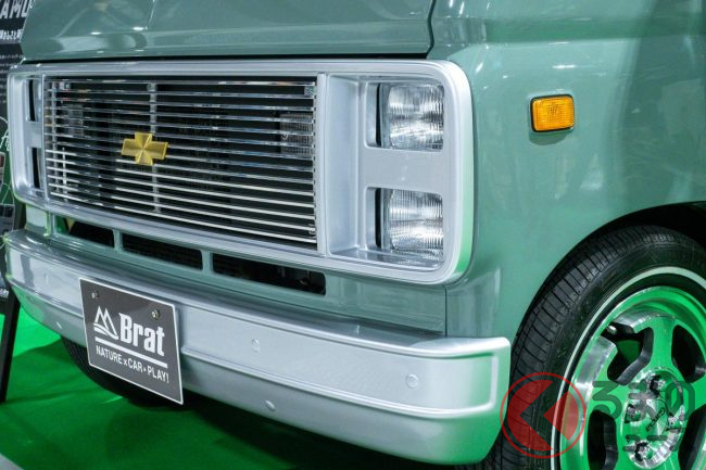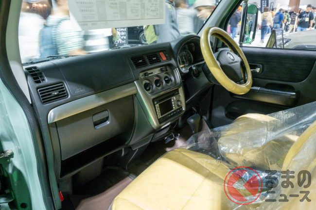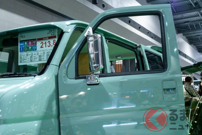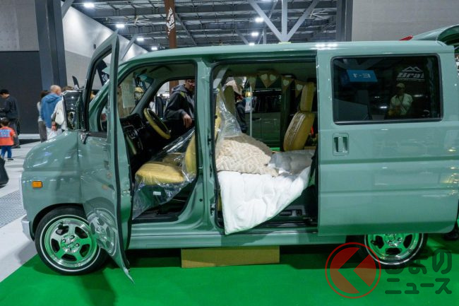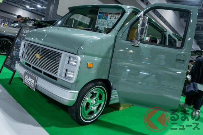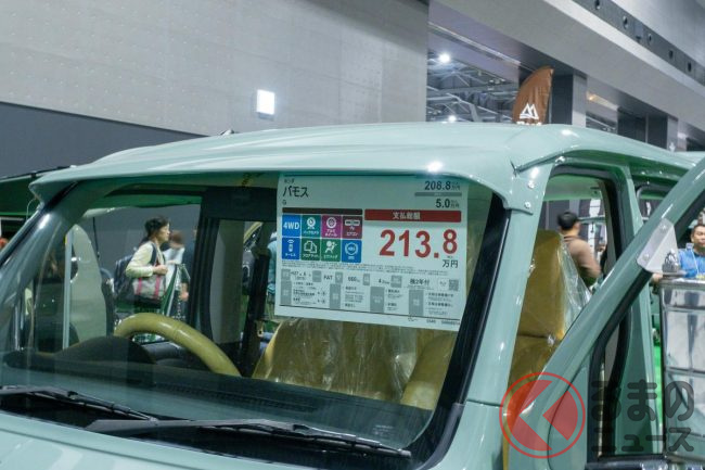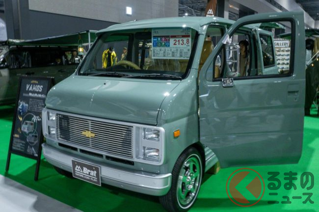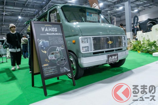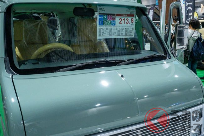 約213万円! 旧車デザインの「バモス“カスタム”」実車展示! 角目の“アメ車“顔が超カッコイイ「ホンダ製“軽バン”」登場