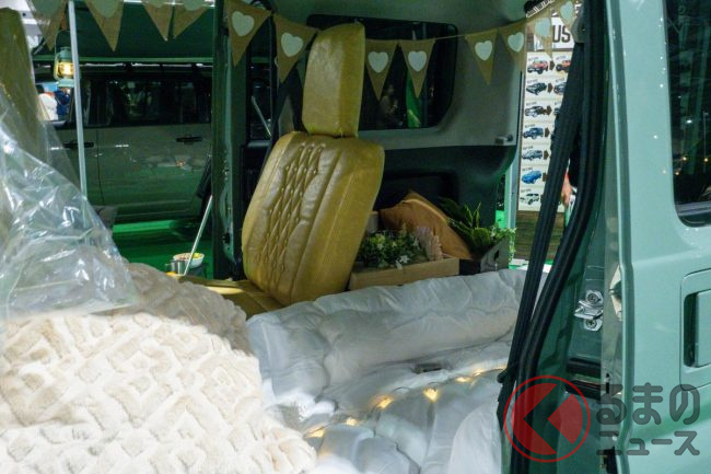 内装はシートやステアリングホイールにベージュのカバーを装備。さらに後部座席を倒すことで、車中泊仕様に変更できます。